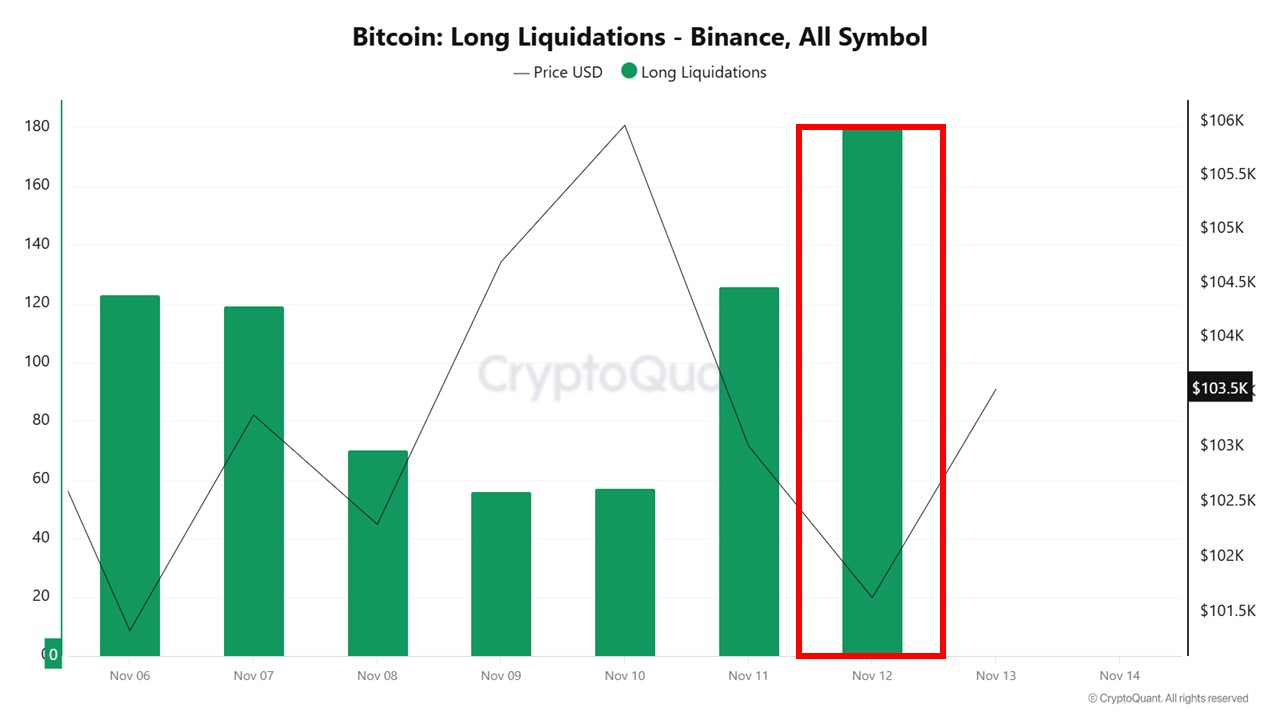 Bitcoin fell below $103,000 on November 12, triggering one of the largest waves of long liquidations on Binance as leveraged positions were rapidly unwound.