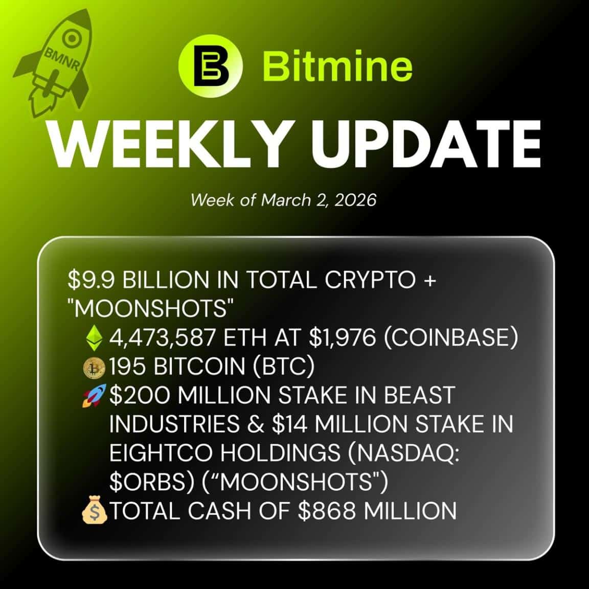 As of March 1, 2026 at 2:00pm ET, the Company’s crypto holdings are comprised of 4,473,587 ETH at $1,976 per ETH (NASDAQ: COIN), 195 Bitcoin (BTC), $200 million stake in Beast Industries, $14 million stake in Eightco Holdings (NASDAQ: ORBS) (“moonshots”) and total cash of $868 million. Bitmine’s ETH holdings are 3.71% of the ETH supply (of 120.7 million ETH).