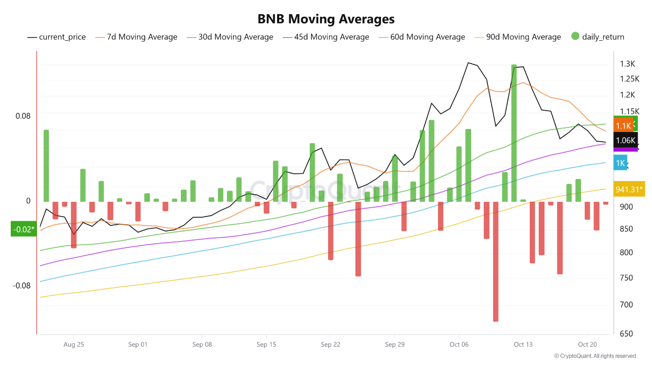 Crazzyblockk shared that BNB has tested and respected its 45-day moving average, emphasizing its role as a pivotal dynamic support. Latest price data shows BNB trading at approximately $1.06K, right on the 45-day moving average. The 90-day moving average is at $941, confirming the steady uptrend since the start of Q3.